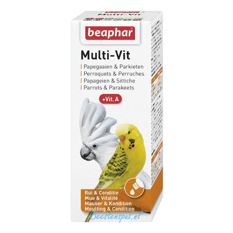 Multi-Vit bevat 12 verschillende soorten vitaminen waaronder de voor papegaaien en parkieten belangrijke vitamine A.