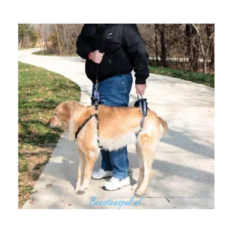 Het unieke ontwerp van het achterste gedeelte, ondersteund de hond vanaf beide heupen en buik, wat minder stress veroorzaakt.