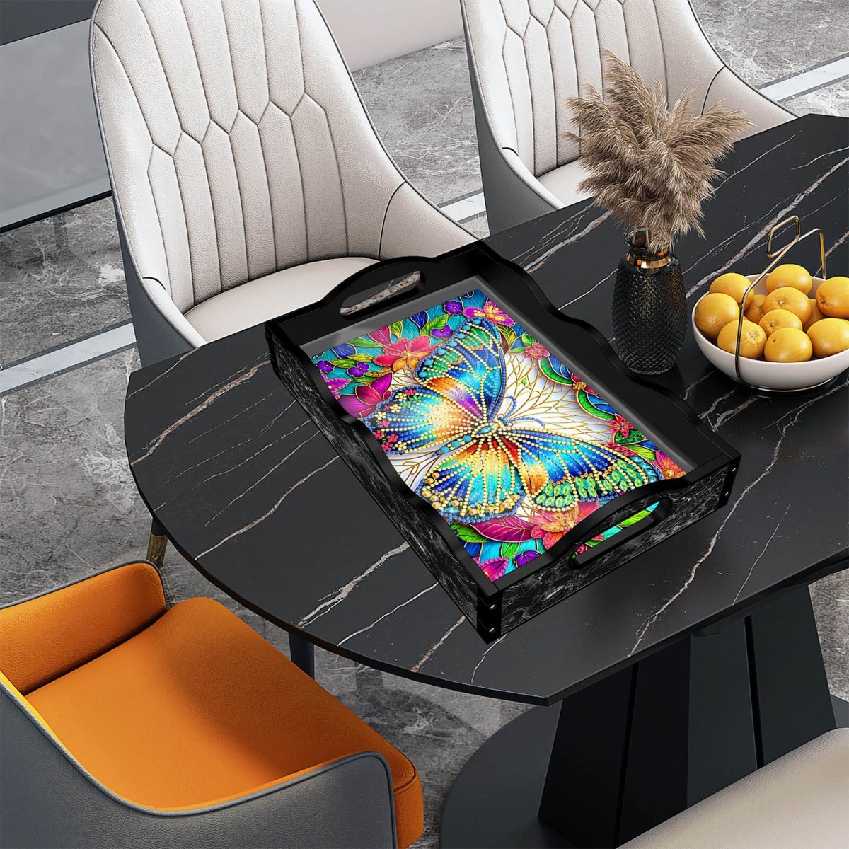 Op zoek naar een opvallend en creatief project dat ook nog eens praktisch is? Dit Diamond Painting dienblad (zwart) met vlinder-design en golvende zwarte randen is een echte eyecatcher. Of je het nu gebruikt voor een sfeervol ontbijt op bed, als kleurrijke decoratie of als origineel cadeau. Met dit dienblad voeg je iets bijzonders toe aan je huis.