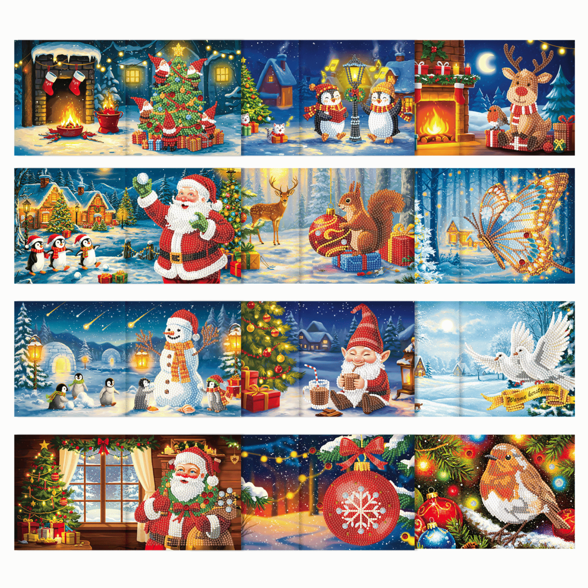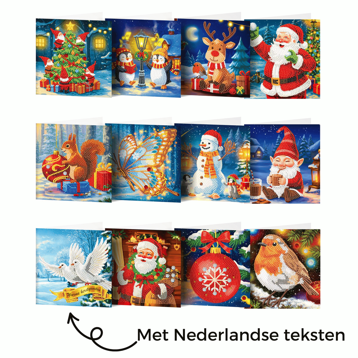 ✔ 12 unieke Diamond Painting kerstkaarten (15×15 cm) met sfeervolle kerstontwerpen