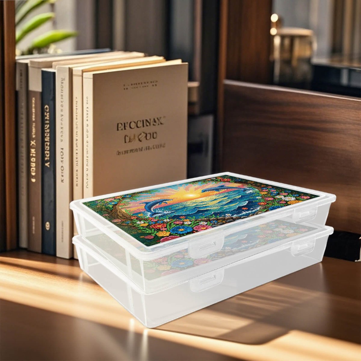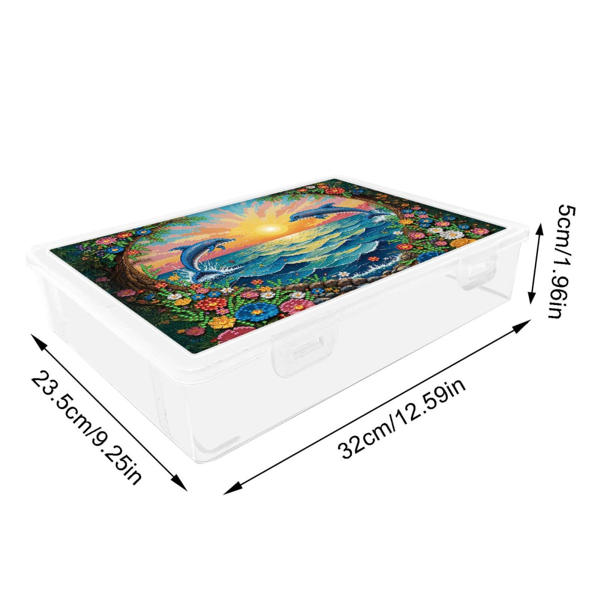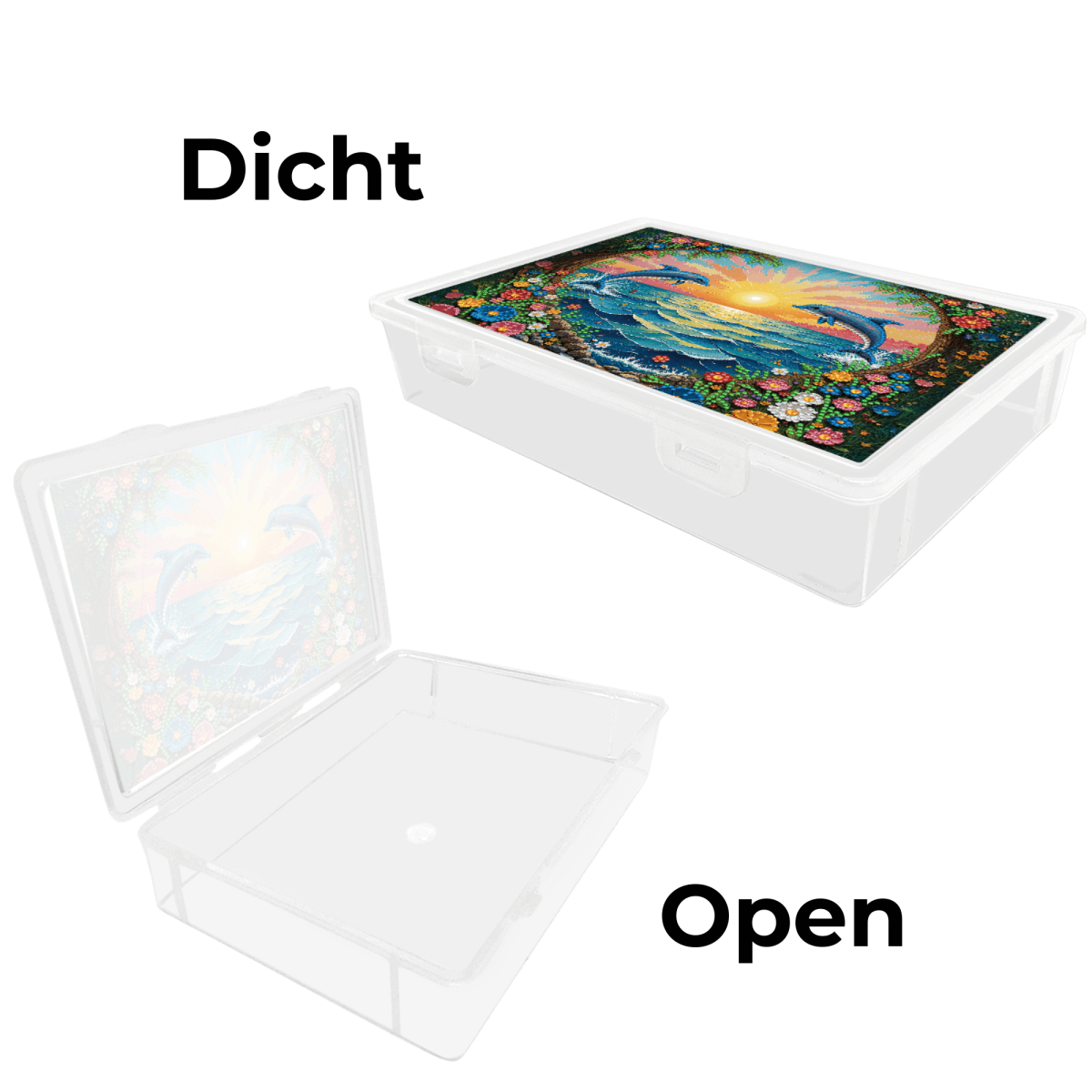 Geef je hobbyspullen een vaste plek met deze Diamond Painting opbergbox met dolfijnen. Het vrolijke zeezicht met zonsondergang en springende dolfijnen maakt de deksel een echte blikvanger, terwijl jij ondertussen netjes kunt opbergen. Ideaal voor Diamond Painting accessoires, kleine projecten of knutselspullen die je graag bij elkaar houdt.