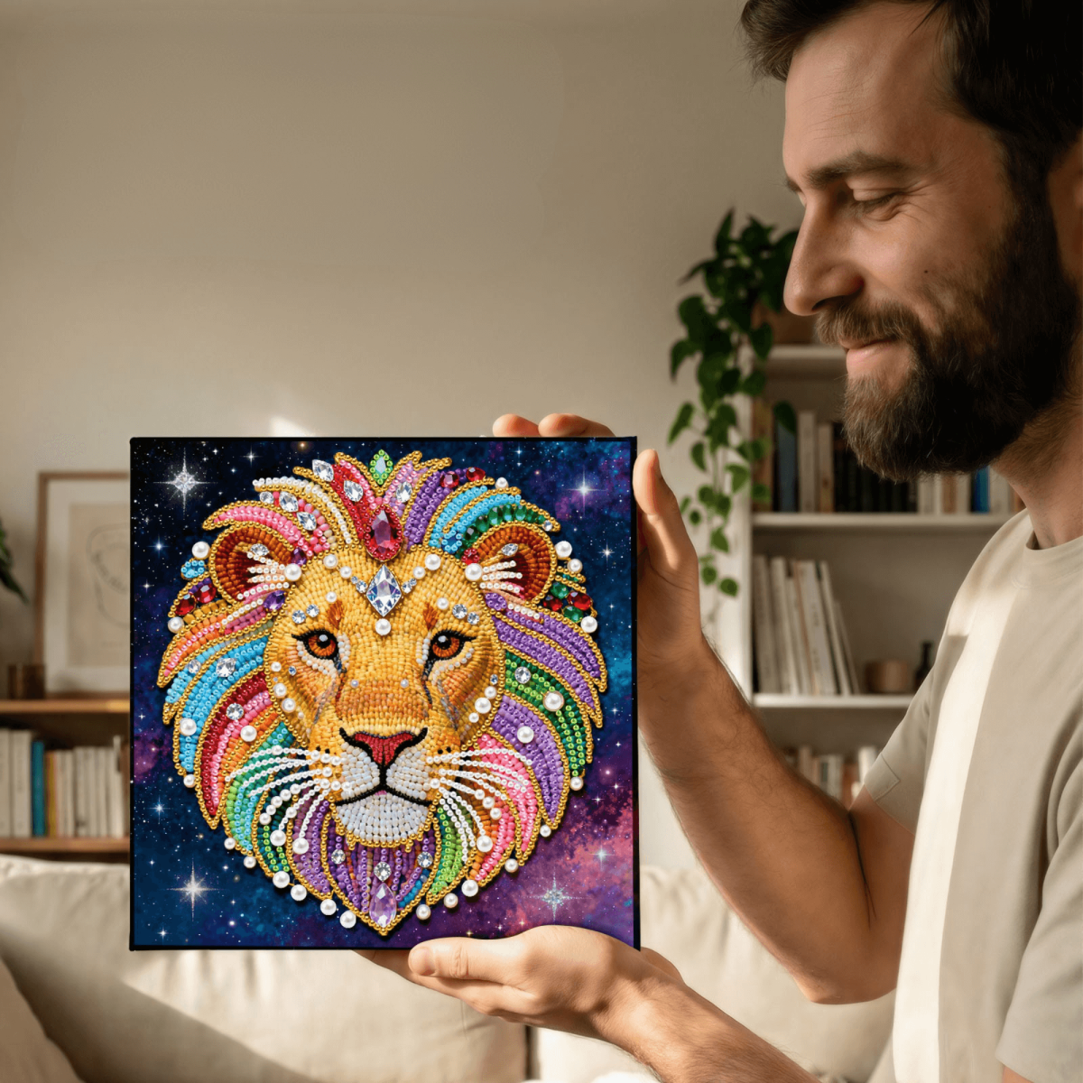 Dit Diamond Painting schilderij op houten frame is bedoeld om op te hangen en staat daardoor mooi in bijvoorbeeld de woonkamer, hobbykamer of slaapkamer. Tijdens het maken werk je vooral aan de glanzende details van de leeuw, de sierlijke accenten en de opvallende kleuren in de manen. Juist dat maakt het extra leuk om het ontwerp stap voor stap tot leven te zien komen.