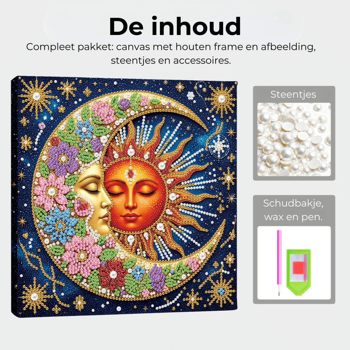 Zoek je een Diamond Painting die ontspannend is om te maken én daarna echt sfeer brengt in huis? Met Diamond Painting Schilderij Maan en Zon uit de Pearl Collectie maak je zelf een bijzondere wanddecoratie met een dromerige, luxe uitstraling. De maan, de zon, het houten frame en de glanzende parelsteentjes zorgen samen voor een opvallend eindresultaat dat direct de aandacht trekt.