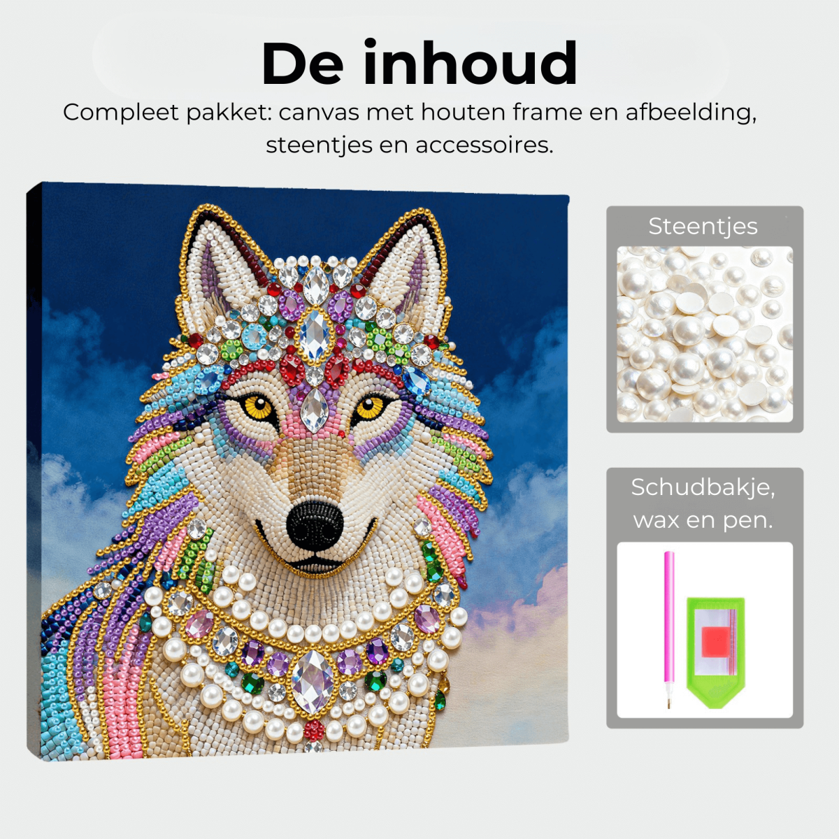 Dit Diamond Painting schilderij wolf is perfect als je houdt van dieren, zachte kleuren en een ontwerp dat nét even anders is dan standaard. De wolf staat centraal in het schilderij en springt direct in het oog door de heldere ogen, kleurrijke details en glanzende accenten. De combinatie van parelsteentjes, sierlijke lijnen en de rustige lucht op de achtergrond geeft het schilderij een dromerige en chique uitstraling. Leuk om zelf te maken, maar ook heel geschikt om cadeau te geven.