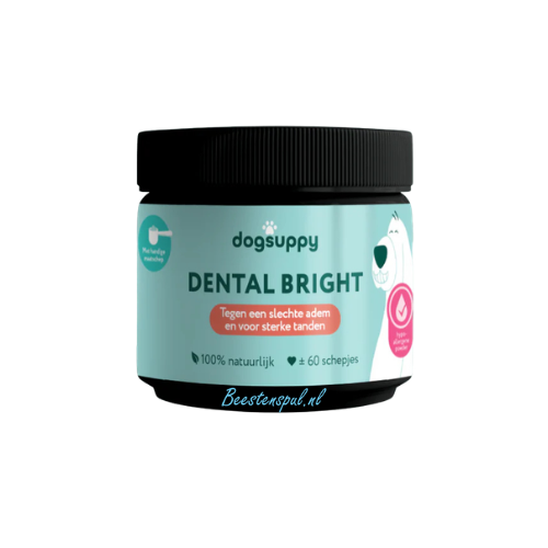 Dental Bright is een 100% natuurlijk poeder dat je eenvoudig over het voer van je hond strooit en zo dagelijks bijdraagt aan een gezonde mond.