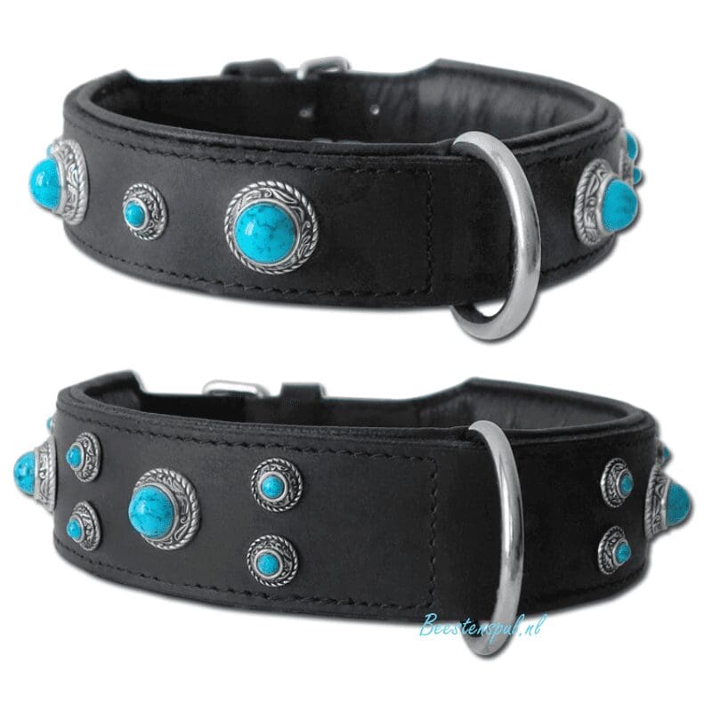 Hij heeft chroom/ turquoise versieringen, dit maakt de halsband een echte eyecatcher.
