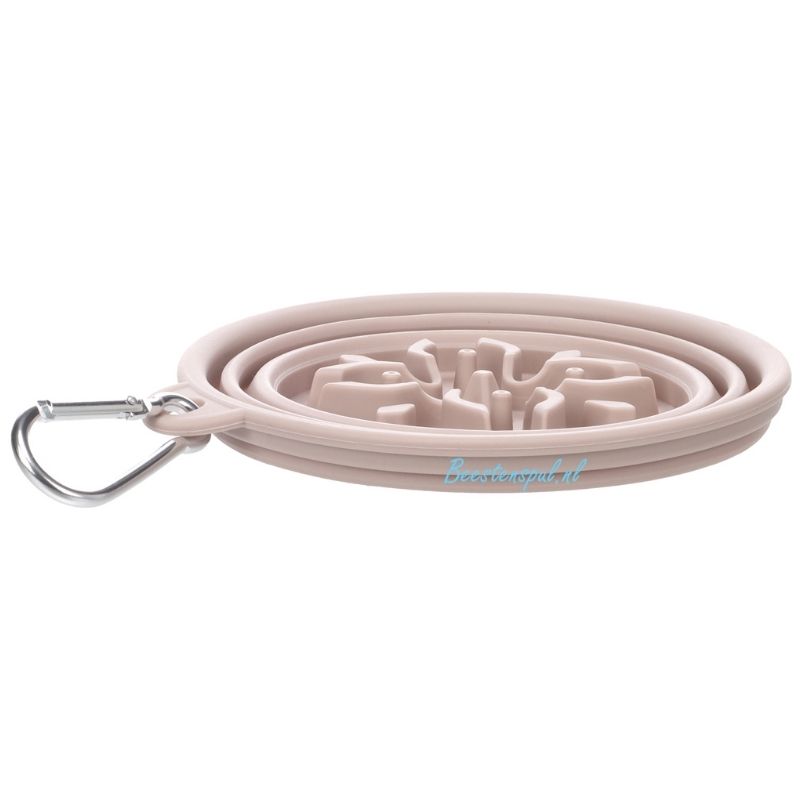 De taupe Nino slow feeder is een flexibele, opvouwbare voerbak met karabijnhaak die schrokken voorkomt en geschikt is voor zowel droog- als natvoer!