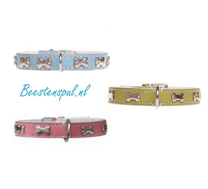 Halsband Blinking Bones is gevoerd met zacht comfortabel kalfsleer en gedecoreerd met zilverkleurige botjes.