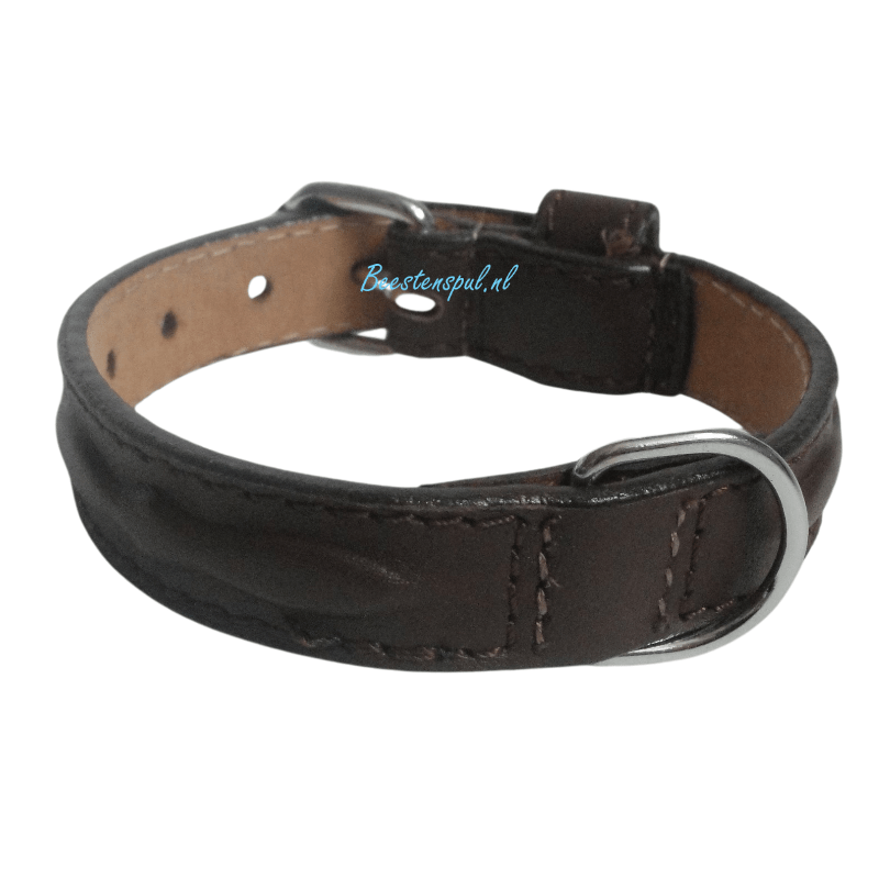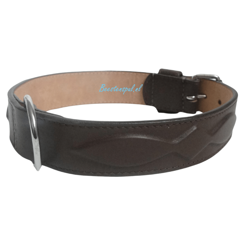 Stevig gestikte halsband met een Tribal vorm, afgewerkt met chroom.