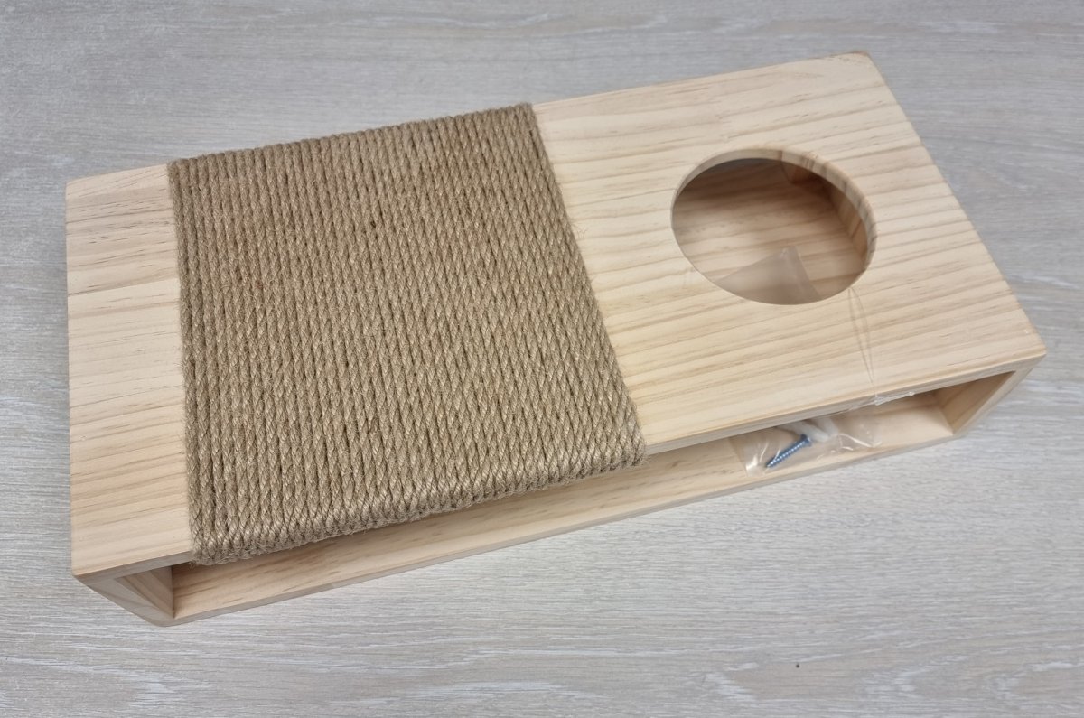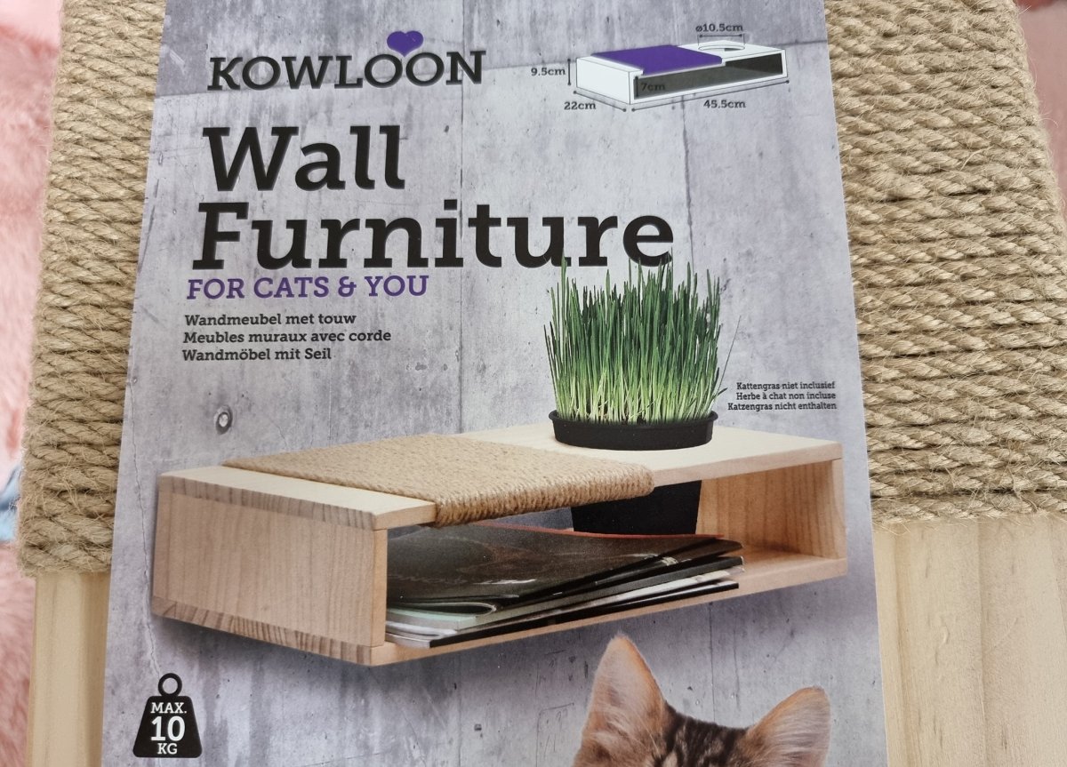 max draag gewicht 10 kg, kan aan de muur gehangen worden of gewoon op de grond gezet worden. Opening voorzien om een kattengras plantje te plaatsen.