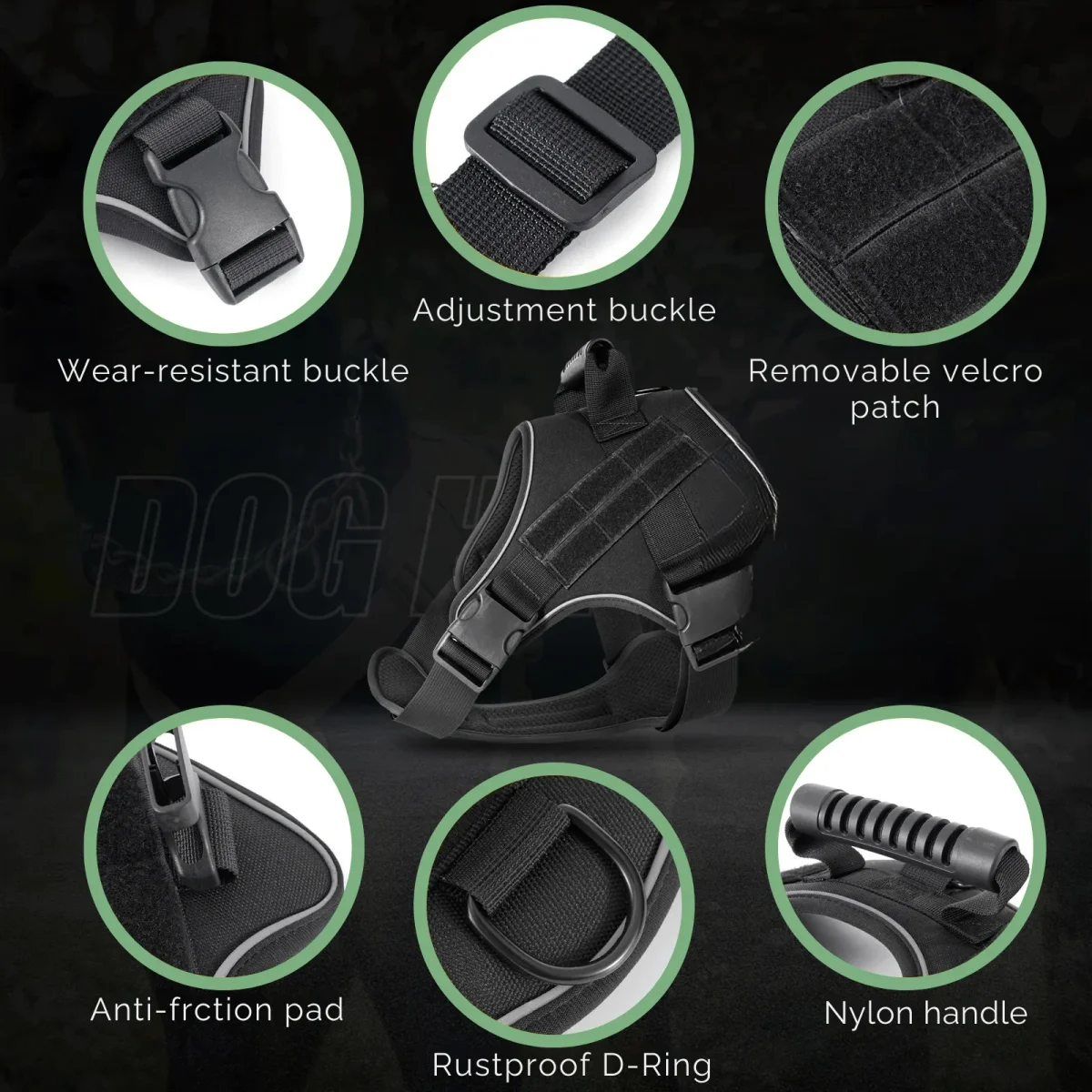 Het vest is gemaakt van extreem sterk, tactisch materiaal en is gebouwd om de zwaarste omstandigheden te weerstaan. Het ergonomische ontwerp verdeelt de druk gelijkmatig over de borst, waardoor de nek en wervelkolom van je hond worden ontlast.