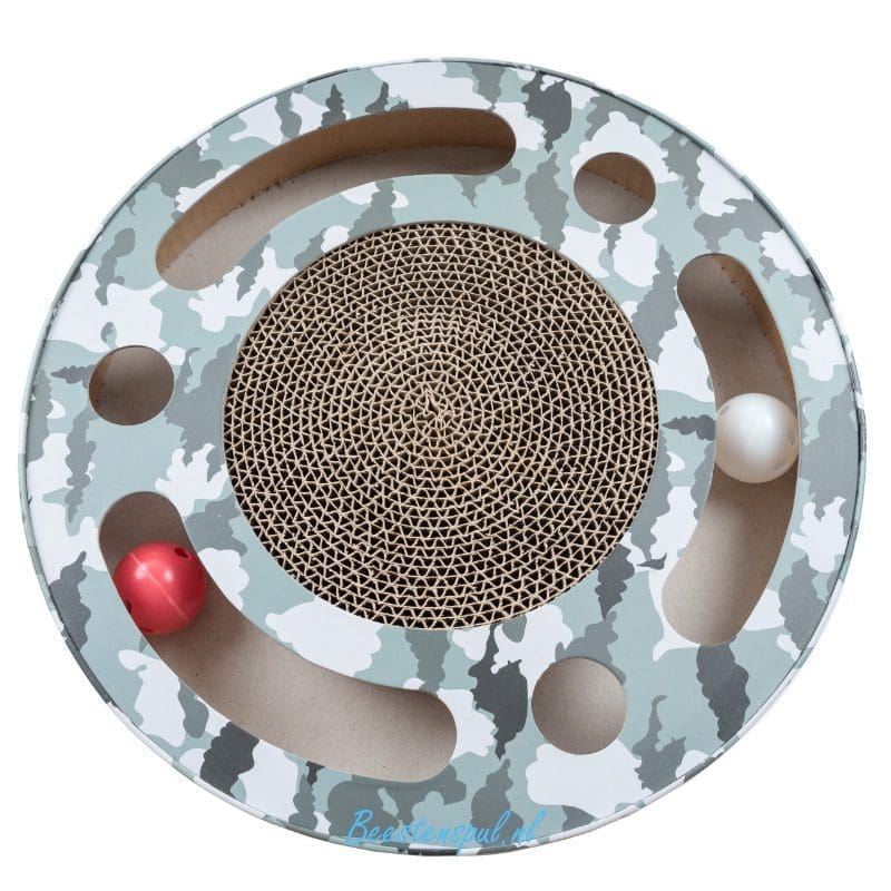 Een rond kattenspeeltje gemaakt van recyclebaar karton met groene camouflage afwerking, bijgeleverd zakje catnip.