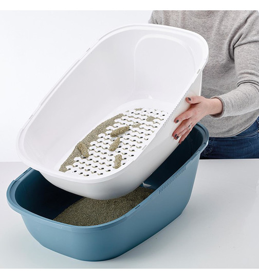 Gesloten bak uitgerust met een verwijderbare zeef voor kattenbakvulling, die zowel grove als fijne klompen uitzift. Het toilet bestaat uit twee kommen en een zeef. Als u de zand wil reinigen, verwijdert u gewoon de bovenste schaal en blijft het vuil in de zeef. De 6 mm brede gaten maken het gemakkelijk om uitwerpselen en klonten te scheiden van de propere zand door ze voorzichtig te zeven. Dit kan dan opnieuw worden gebruikt. Dit slimme systeem draagt bij aan een bijzonder zuinig verbruik. De kap en de onderste schaal kunnen vervolgens worden vastgemaakt binnen enkele seconden met de grote clips aan de zijkanten. Dit toilet is een aantrekkelijke oplossing voor elk designbewust dierlijkvriendelijk huishouden!