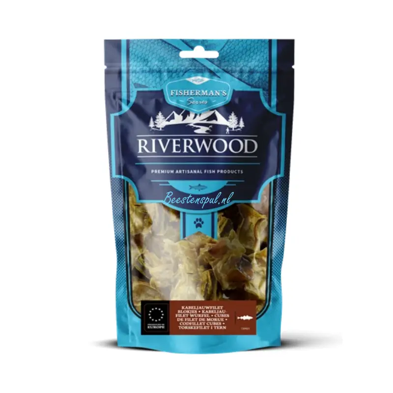 De Riverwood Kabeljauwfiletblokjes zijn natuurlijke snacks welke voor 100% uit Kabeljauw bestaan.