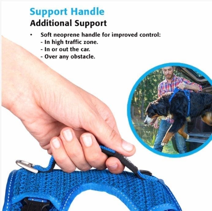 Met gevoerde borst- en rugplaat voor extra ondersteuning en een support handvat waarmee u gemakkelijk ondersteuning kunt bieden bij het nemen van obstakels, tijdens het oversteken, in/uit de auto springen, enz.