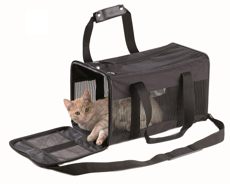 Vervoerstas met handgrepen en verwijderbare draaggordel. Met adreslabel en een zijzak. Voorzien van gaasinzetstukken voor goede luchtcirculatie.