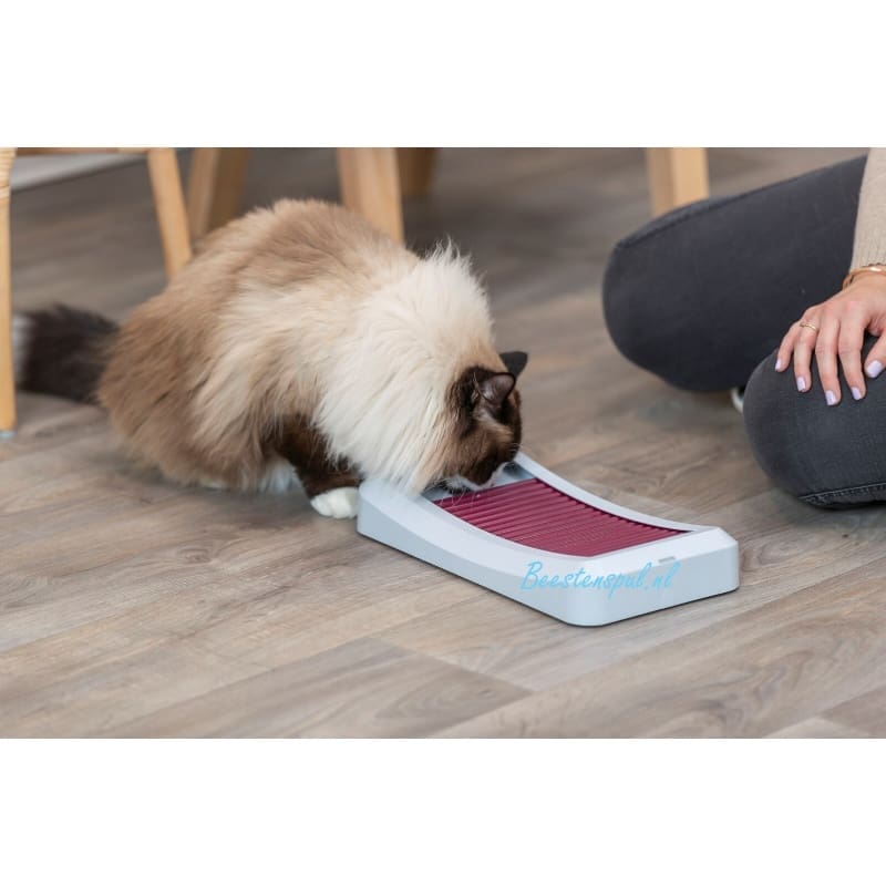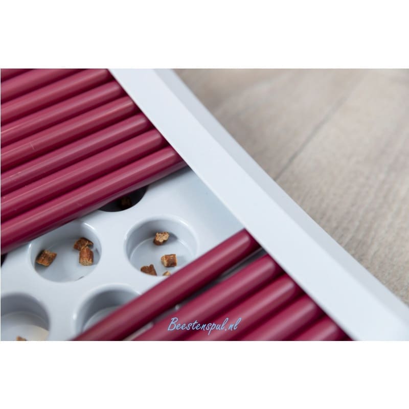Verstop beloningen in de kuiltjes onder de staafjes en zie hoe uw kat de staafjes gaat verschuiven om de lekkernijen te pakken te krijgen.