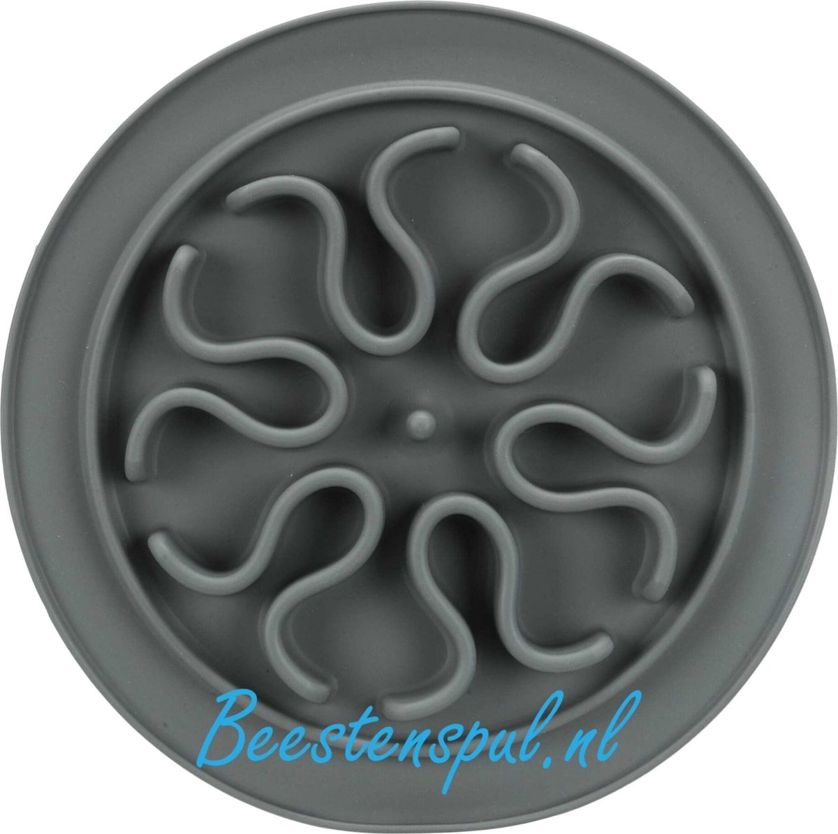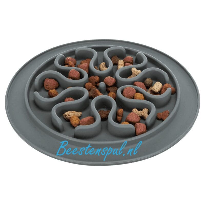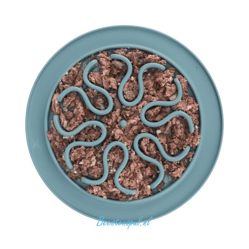 Deze mat bevat opstaande randen in een patroon, waardoor de hond verplicht is veel rustiger te eten.