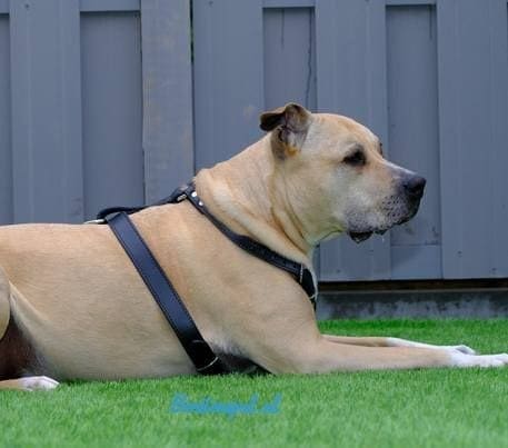 Een zeer degelijk doorgestikt tuig met grote chroom ringen en beslag.