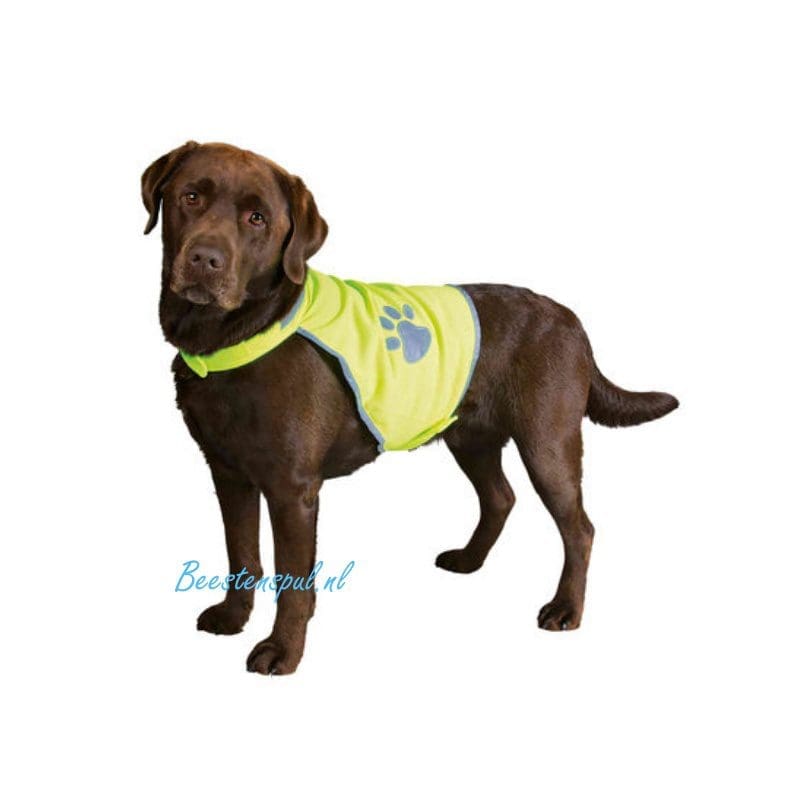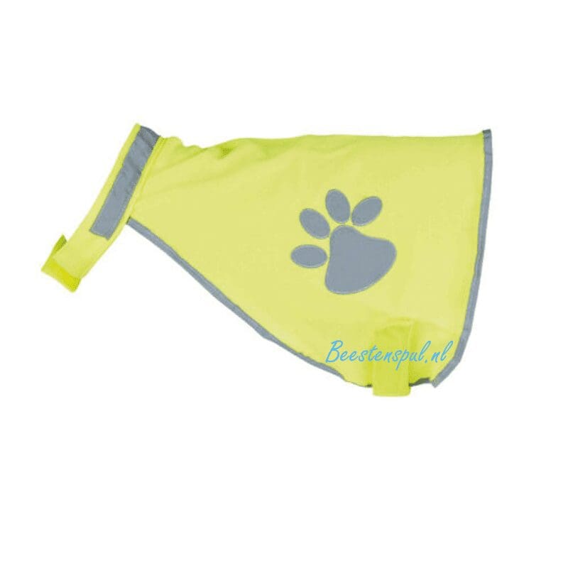 Een reflecterend veiligheidsvest, afgewerkt met grijs reflectieband en een pootprint op de zijkant.