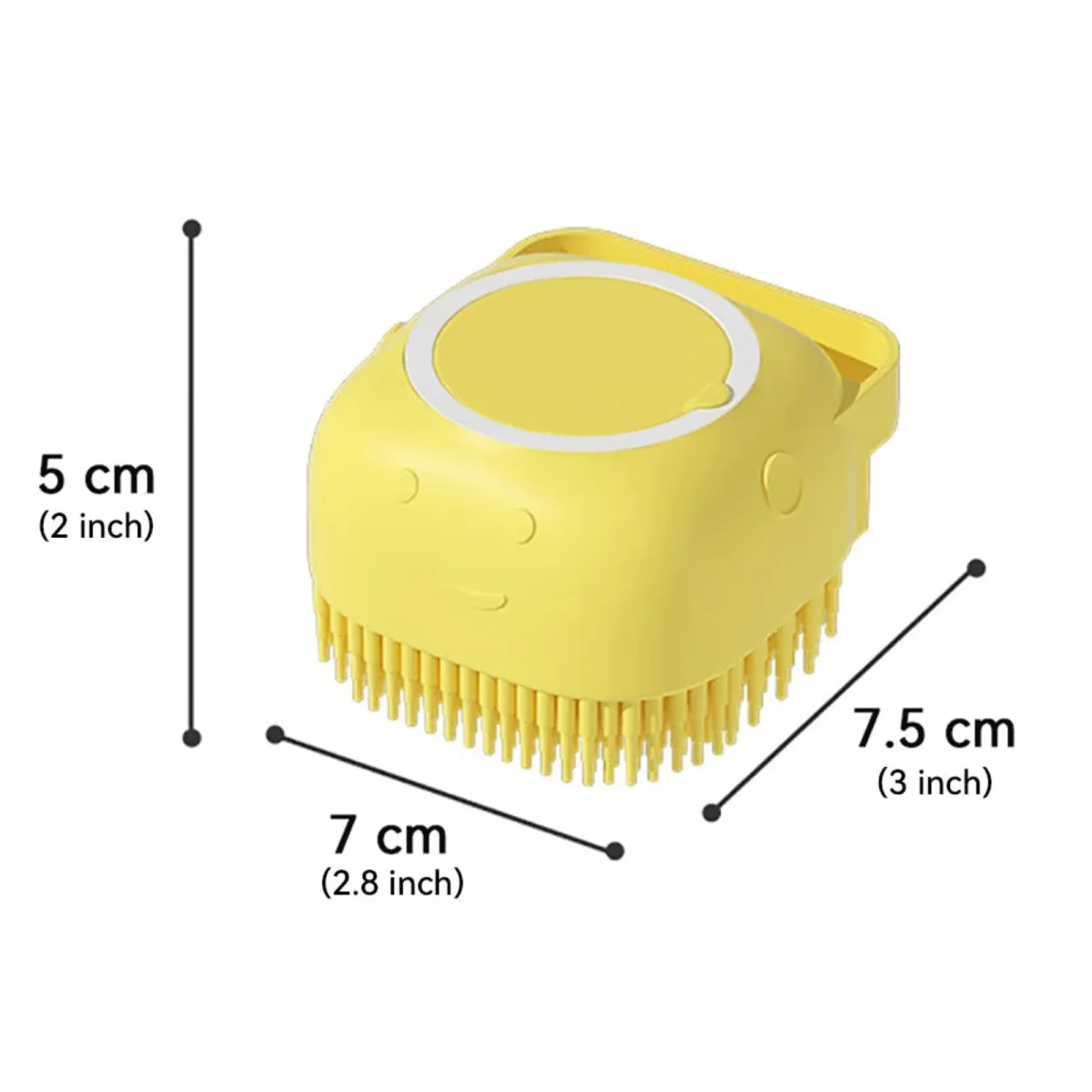 Badborstel met Shampoo Dispenser (Kleur naar keuze): Een zachte siliconen badborstel met geïntegreerd schuimreservoir voor efficiënt wassen en masseren. Verwijdert vuil en losse haren en is geschikt voor korte en lange vachten van honden, katten en kleine huisdieren. Verkrijgbaar in blauw, roze of geel. Afmetingen: 7.5 × 7 × 5 cm.