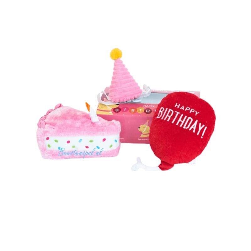 Dit leuke verjaardagscadeau bestaat uit 2 verschillende speeltjes en een verjaardagshoedje.